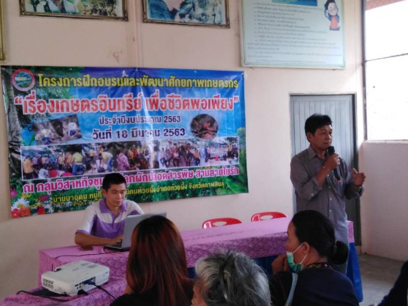 รายละเอียด : โครงการฝึกอบรมและพัฒนาศักยาภาพเกษตรกร "เรื่องเกษตรอินทรีย์ เพื่อชีวิตพอเพียง" ประจำปีงบประมาณ 2563 วันที่ 18 มีนาคม 2563 ณ กลุ่มวิสาหกิจชุมชนปลูกผักปลอดสารพิา สานใยรัก บ้านนาอุดม หมู่ที่ 2 ตำบลนิคมห้วยผึ้ง อำเภอห้วยผึ้ง จังหวัดกาฬสินธุ์