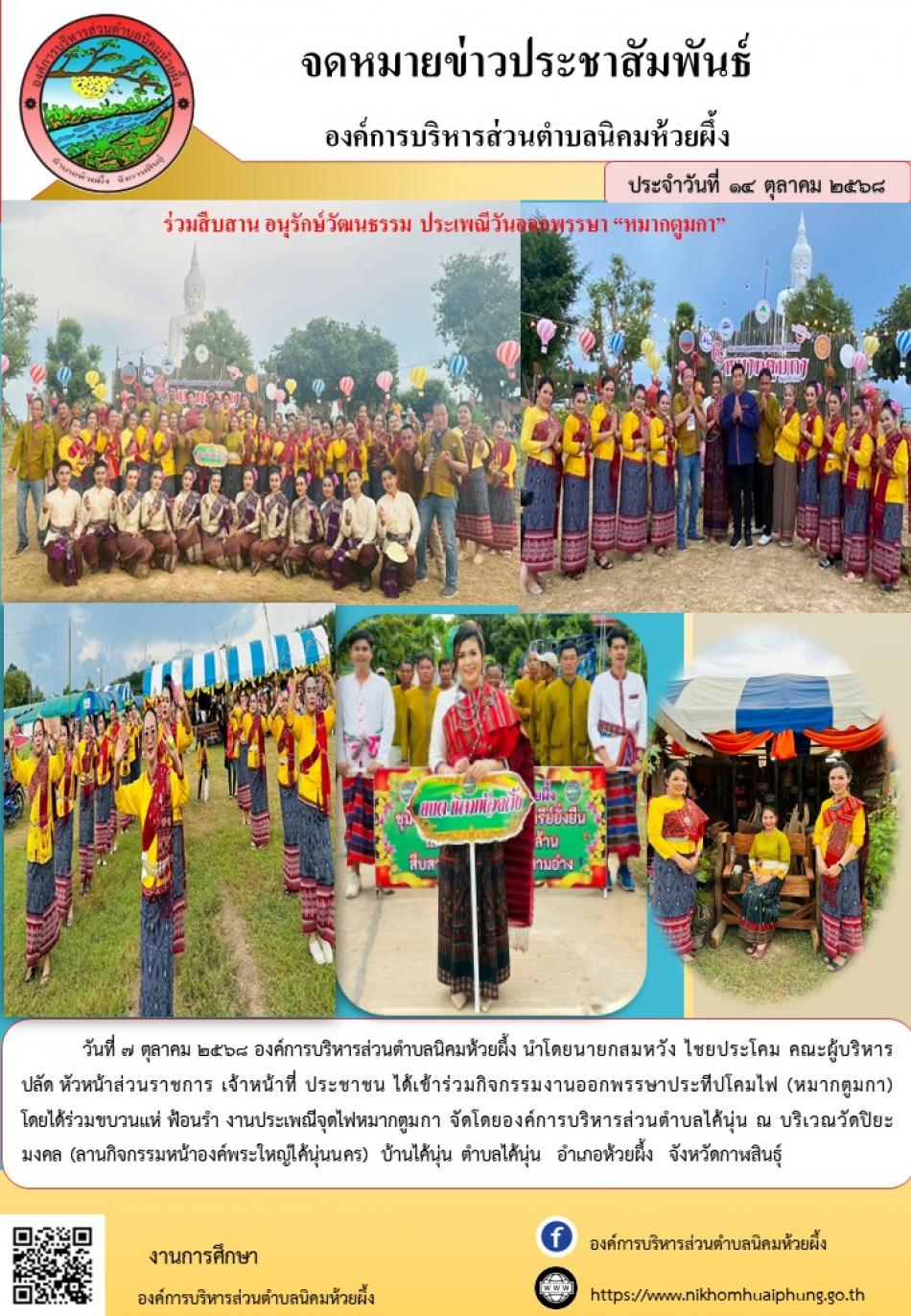 วันที่ 7 ตุลาคม 2568 อบต.นิคมห้วยผึ้ง เข้าร่วมกิจกรรมสืบสาน อนุรักษ์วัฒนธรรม ประเพณีวันออกพรรษา “หมากตูมกา” ณ บริเวณวัดปิยะมงคล (ลานกิจกรรมหน้าองค์พระใหญ่ไค้นุ่นนคร) บ้านไค้นุ่น ตำบลไค้นุ่น อำเภอห้วยผึ้ง ... [14 ตุลาคม 2568]