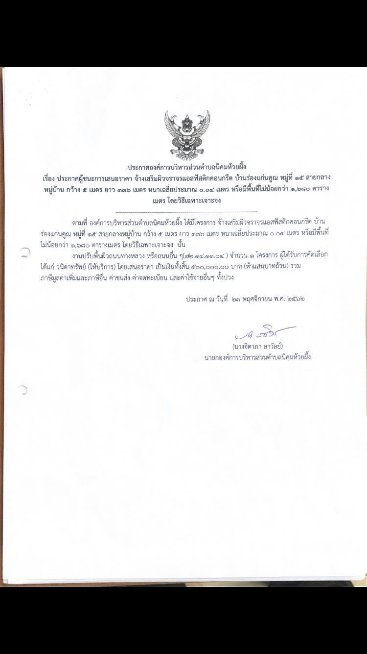 ประกาศผู้ชนะการเสนอราคา เสริมผิวจรจรแอดฟันติก ม.๑๕