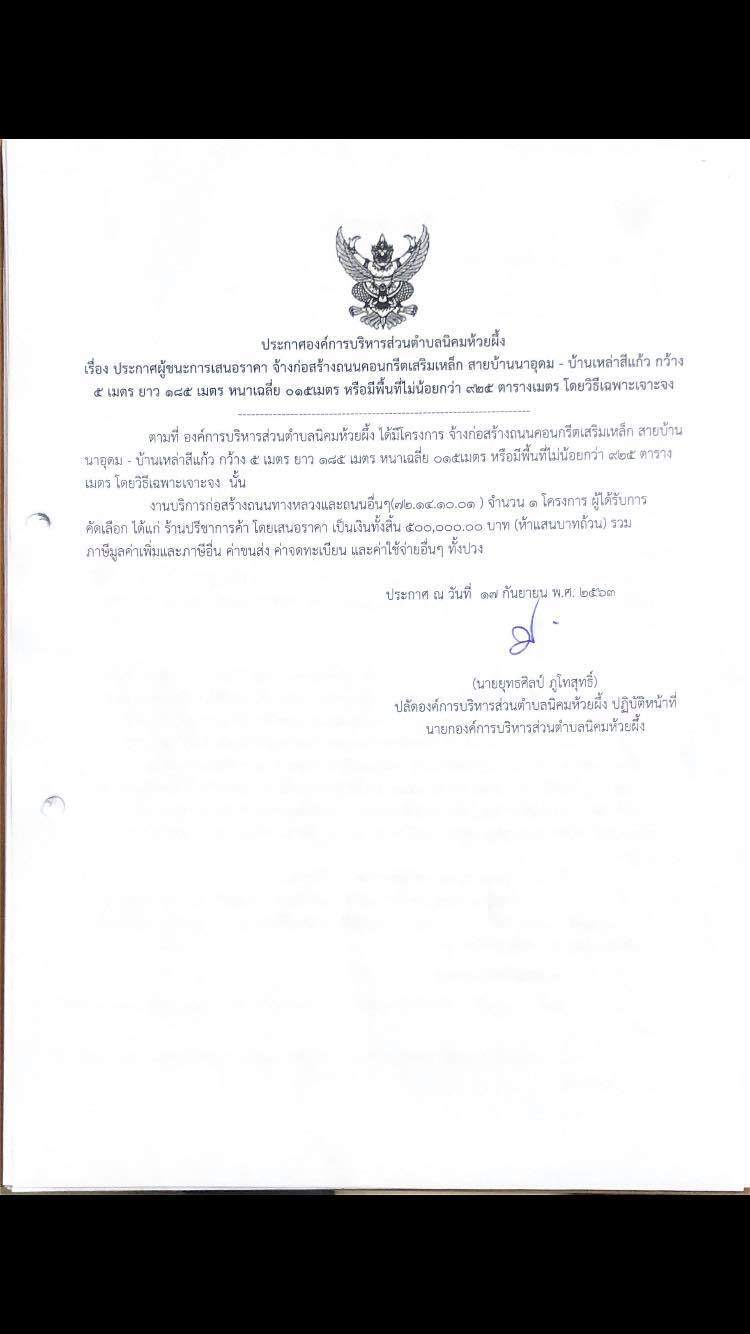 ประกาศผู้ชนะการเสนอราคา คสล.นาอุดม-เหล้าสีแก้ว