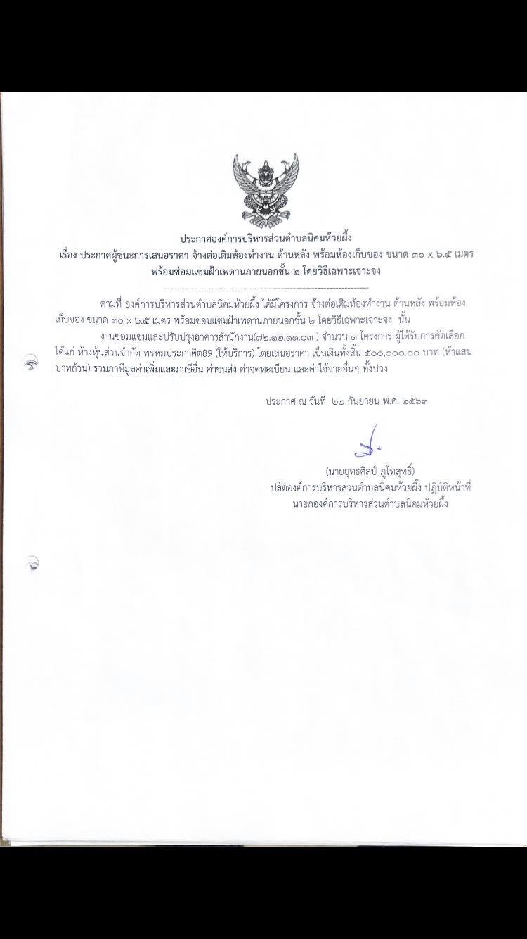 ประกาศผู้ชนะการเสนอราคา ต่อเติมห้องน้ำด้านหลังพร้อมห้องเก็บของ
