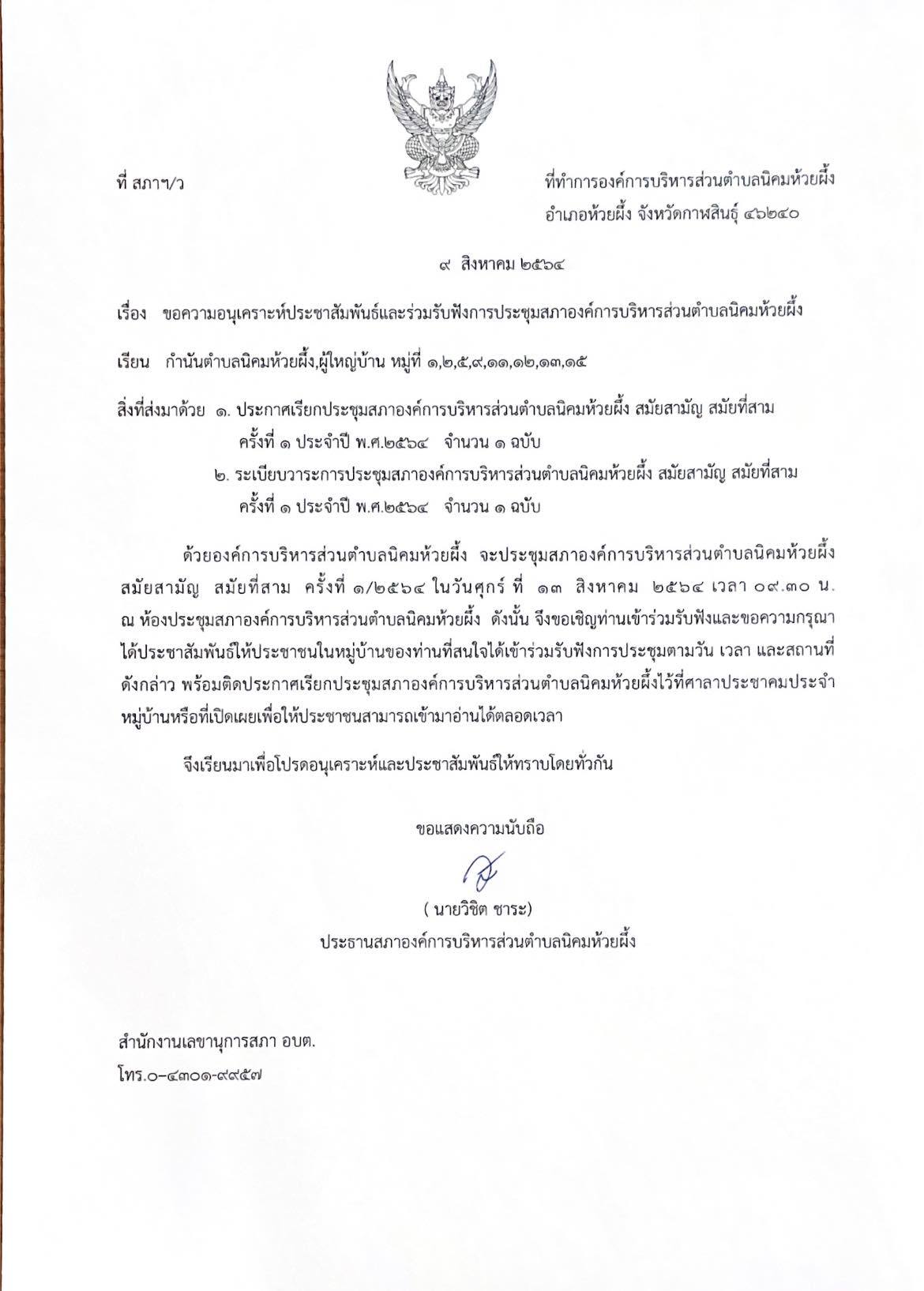 เชิญ กำนัน ผู้ใหญ่บ้าน ประชุมสภา สมัยสามัญ สมัยที่ ๓ ครั้งที่๑/๒๕๖๔
