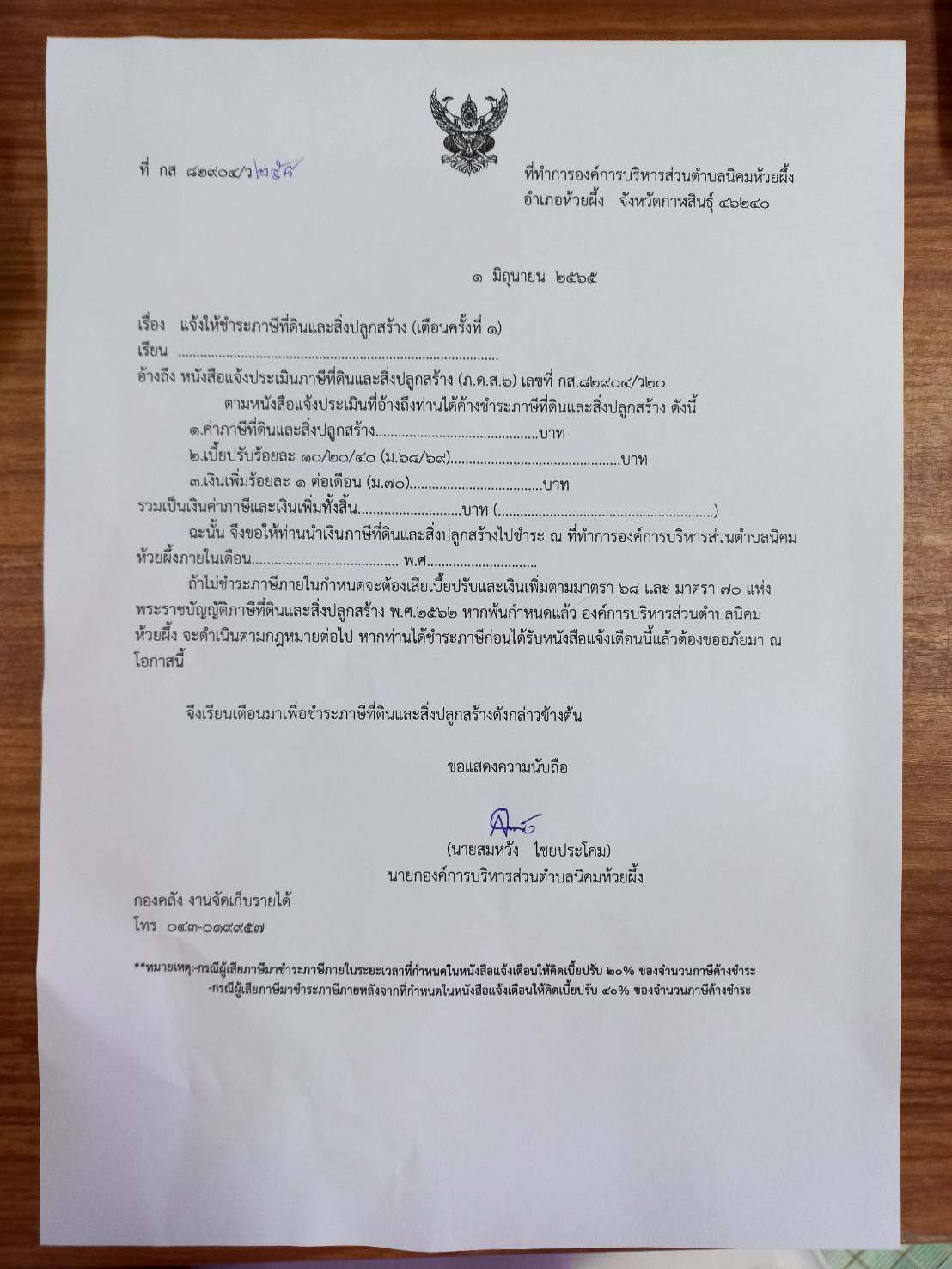 แจ้งให้ชำระภาษีที่ดินและสิ่งปลูกสร้าง