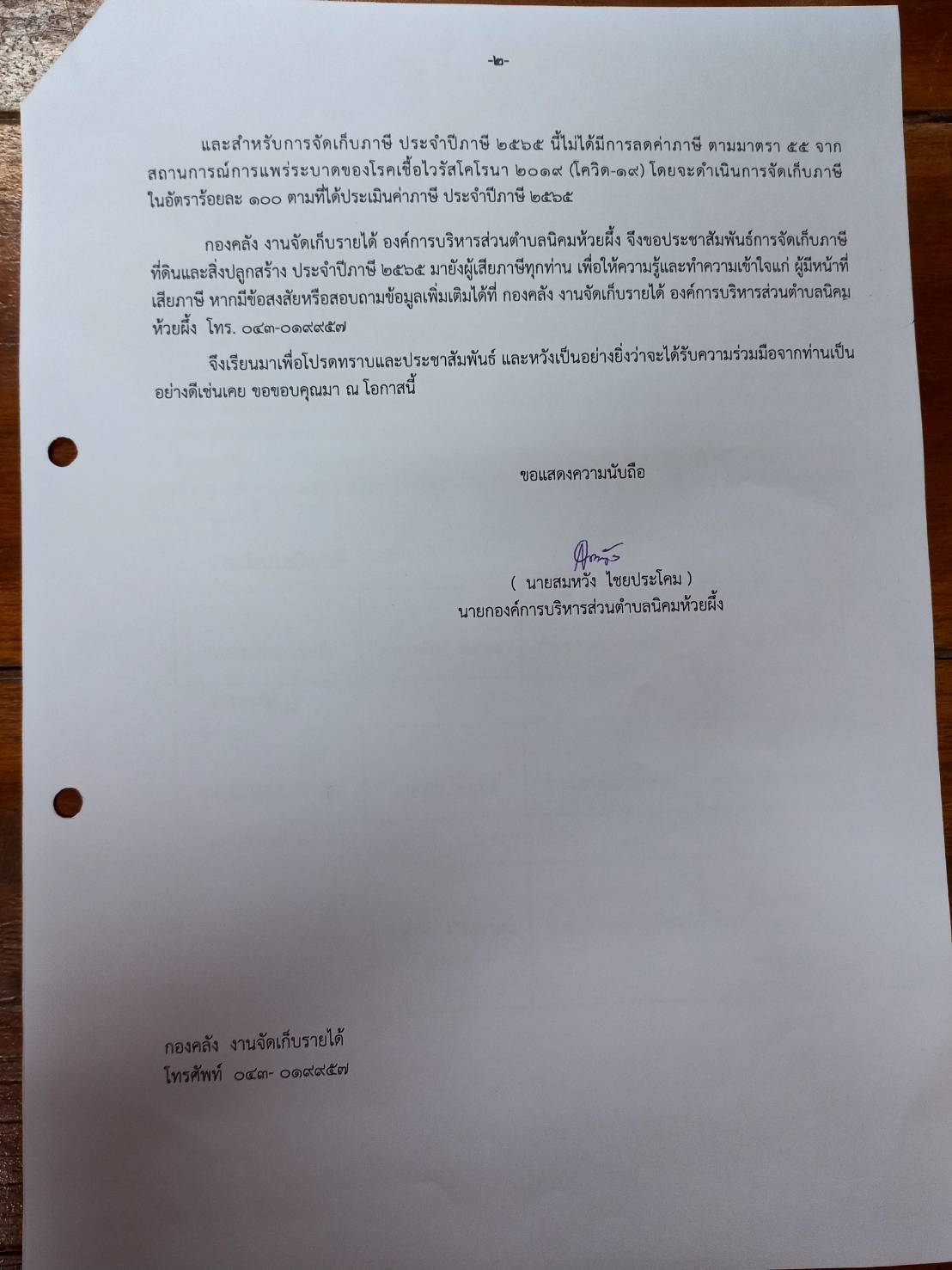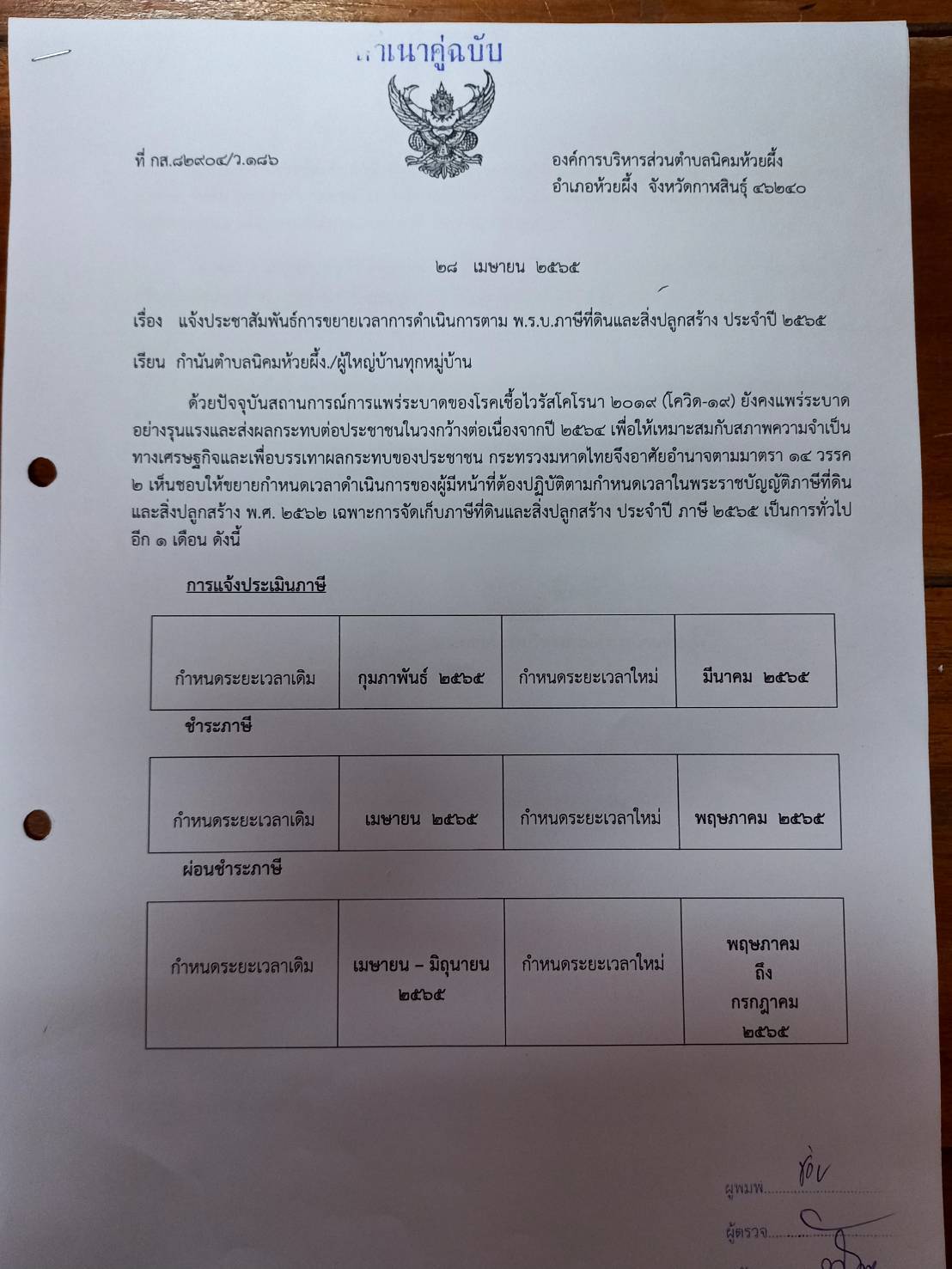 แจ้งประชาสัมพันธ์การขยายเวลาการดำเนินการตาม พ.ร.บ.ภาษีที่ดินและสิ่งปลูกสร้าง ประจำปี 2565