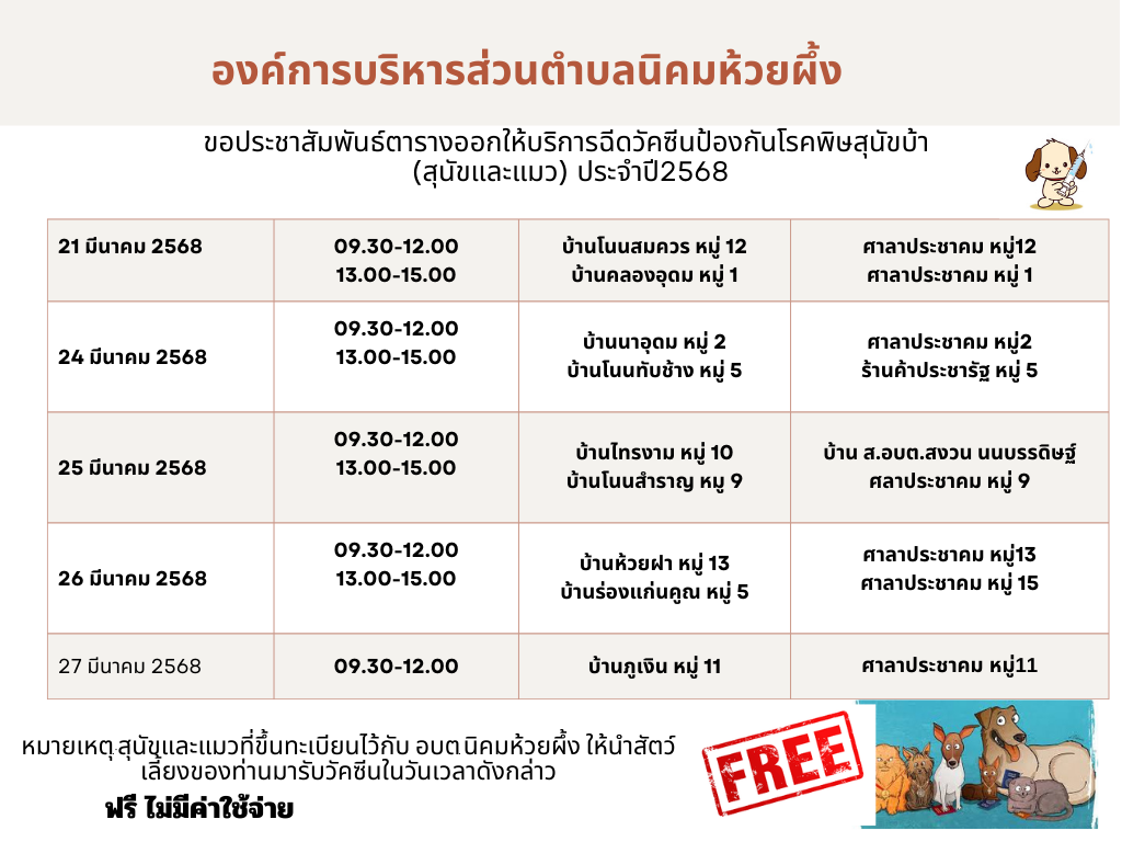 ประชาสัมพันธ์ตารางออกให้บริการฉีดวัคซีนป้องกันโรคพิษสุนัขบ้า (หมาและแมว)