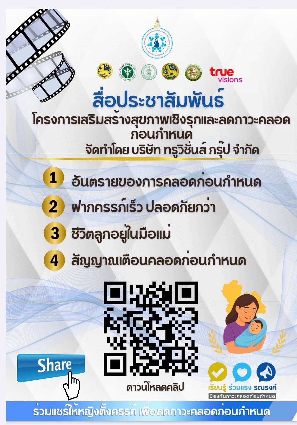 ประชาสัมพันธ์โครงการเสริมสร้าง สุขภาพเชิงรุกป้องกันการคลอดก่อนกำหนด สามารถสแกนและดาวน์โหลดคลิปตาม QR Code