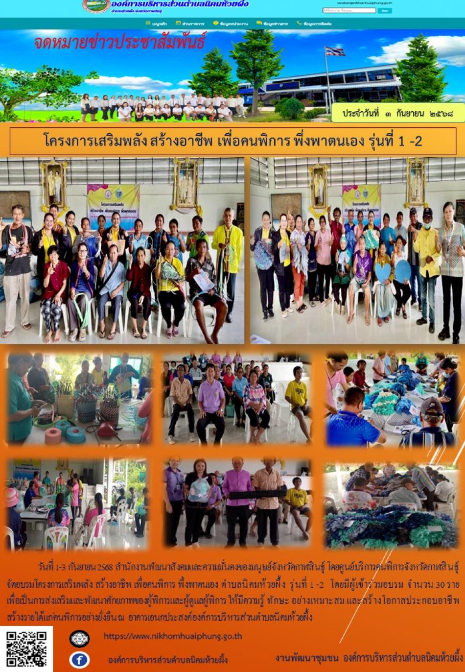 วันที่ 1-3 กันยายน 2568 จัดอบรมโครงการเสริมพลัง สร้างอาชีพ เพื่อคนพิการ พึ่งพาตนเอง ตำบลนิคมห้วยผึ้ง รุ่นที่ 1 -2 ณ องค์การบริหารส่วนตำบลนิคมห้วยผึ้ง [3 กันยายน 2568]