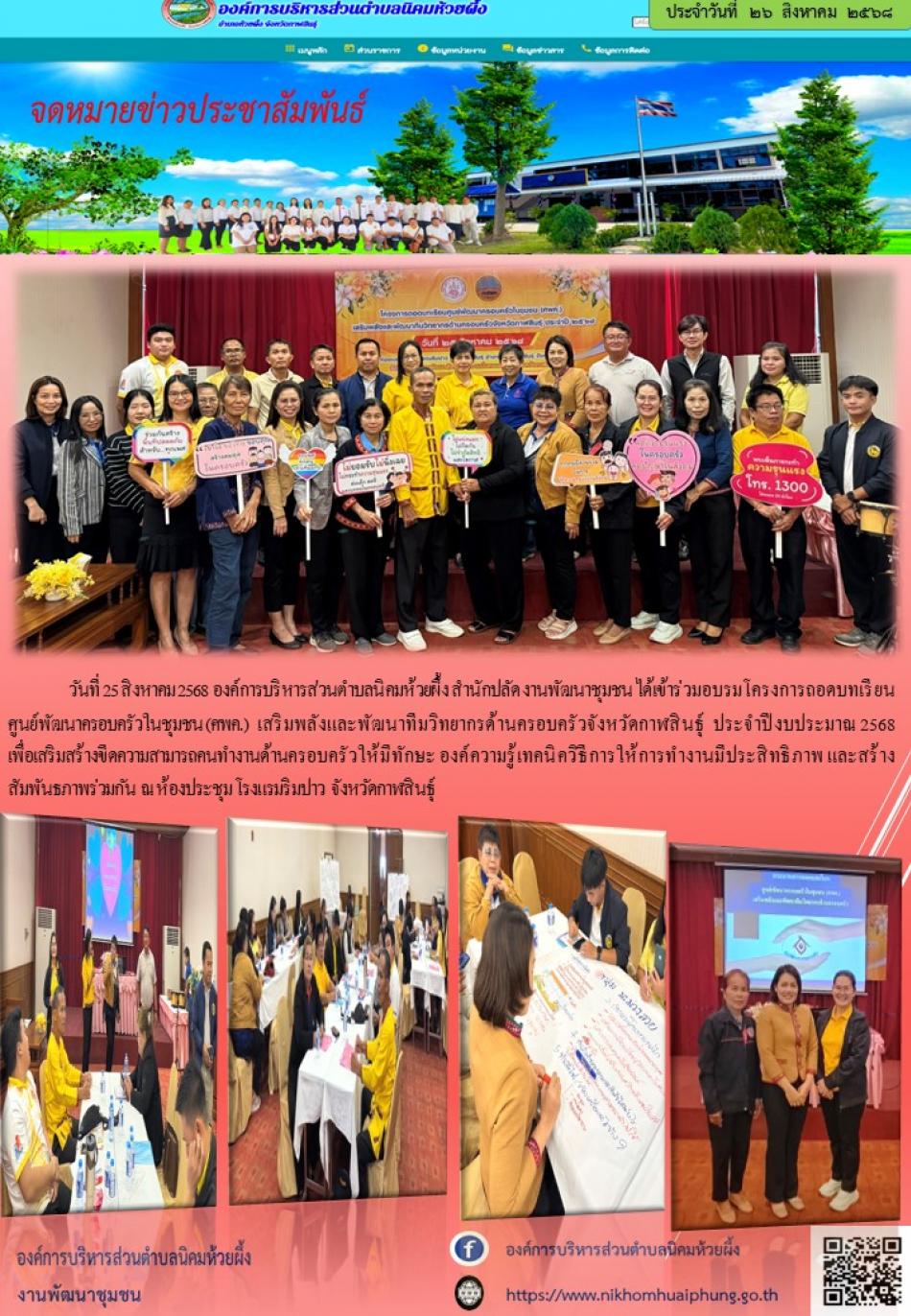 วันที่ 25 สิงหาคม 2568 อบรมโครงการถอดบทเรียนศูนย์พัฒนาครอบครัวในชุมชน (ศพค.) เสริมพลังและพัฒนาทีมวิทยากรด้านครอบครัวจังหวัดกาฬสินธุ์ ประจำปีงบประมาณ 2568 ณ โรงแรมริวปาว จังหวัดกาฬสินธุ์ [26 สิงหาคม 2568]