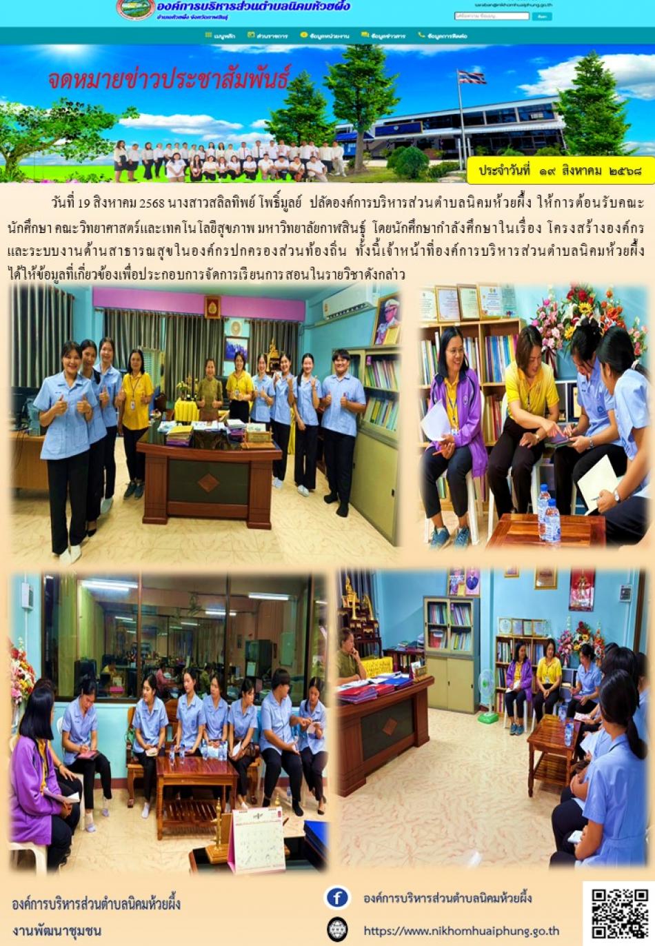 วันที่ 19 สิงหาคม 2568 คณะนักศึกษา คณะวิทยาศาสตร์และเทคโนโลยีสุขภาพ มหาวิทยาลัยกาฬสินธุ์ เข้าขอข้อมูลเพื่อประกอบการเรียนการสอนในรายวิชาที่เกี่ยวข้อง [19 สิงหาคม 2568]
